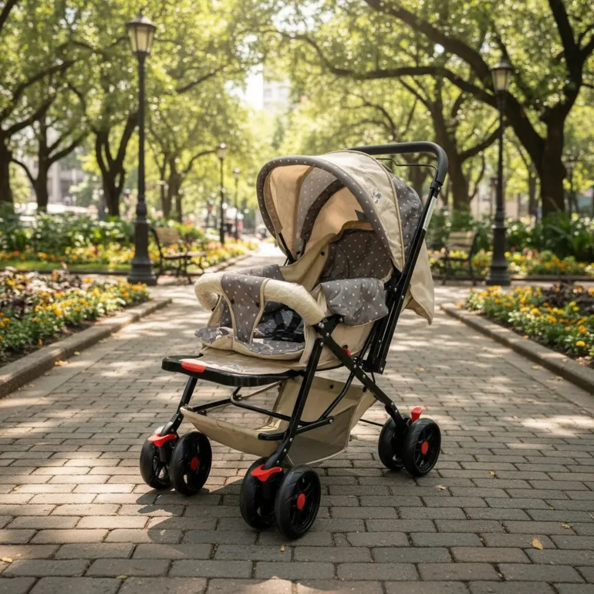 Coche Cuna 3137 Ocho Ruedas todas con freno individual Fácil plegado Ruedas delanteras giratorias Manillar rebatible 3 Posiciones de reclinado Apoya pies regulable Arnés de 3 Ptos. Amplio canasto Capota con diferentes posiciones