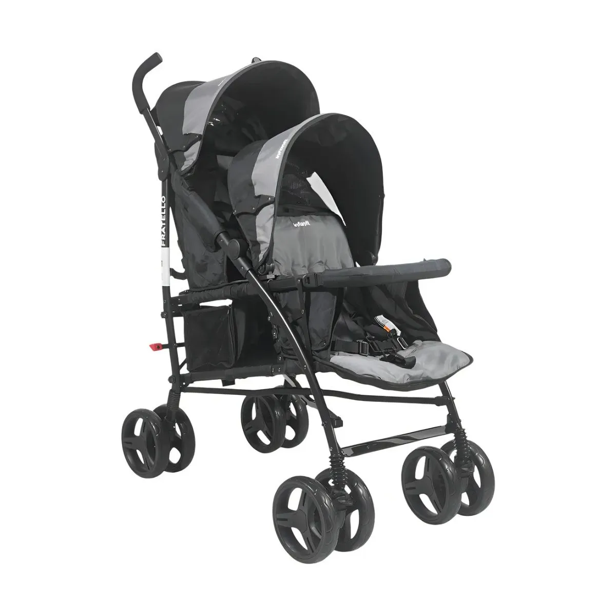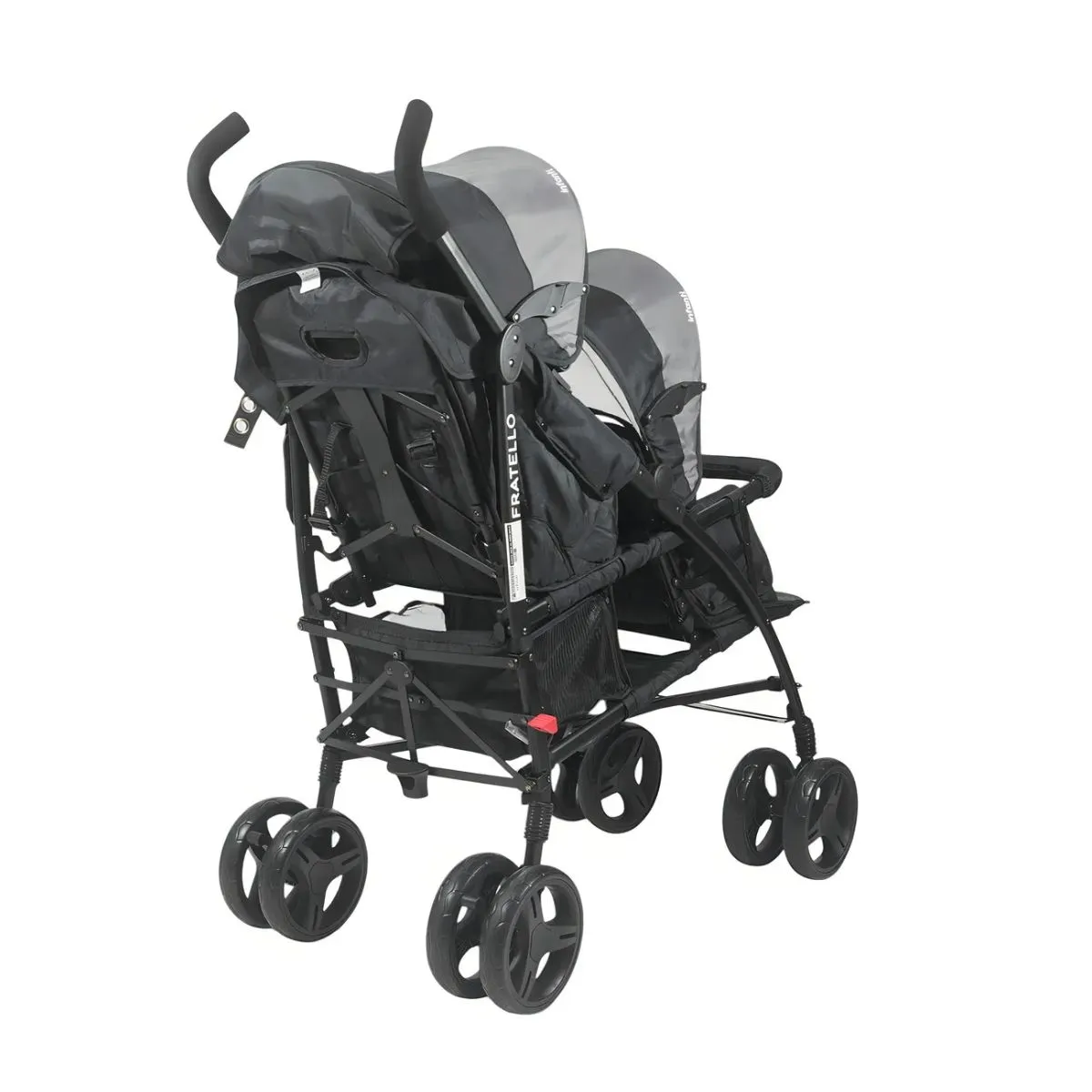 Características: • Apoyabrazos extraíble de uno o ambos lados y forrado con tela removible para su lavado • Arnés de 5 puntas ajustable en 3 alturas y acolchado • Toldos independientes y con visor • Canasta amplia con cierre lateral para un fácil acceso • Asiento delantero para hermano mayor sin reclinación y con apoya pies • Asiento trasero con 3 reclinaciones y apoya pies • Freno en ruedas traseras • Ruedas delanteras giratorias y removibles • Suspensión en sus 4 ruedas • Fácil de plegar • Al plegar abrir cierre del toldo delantero y mover toldo hacia adelante
