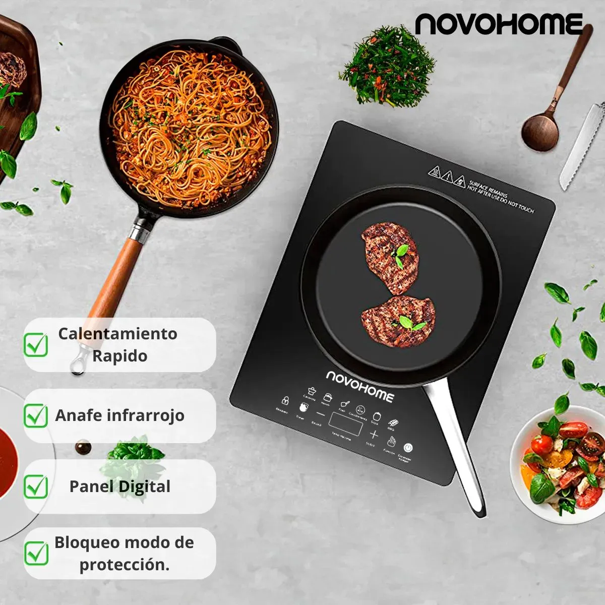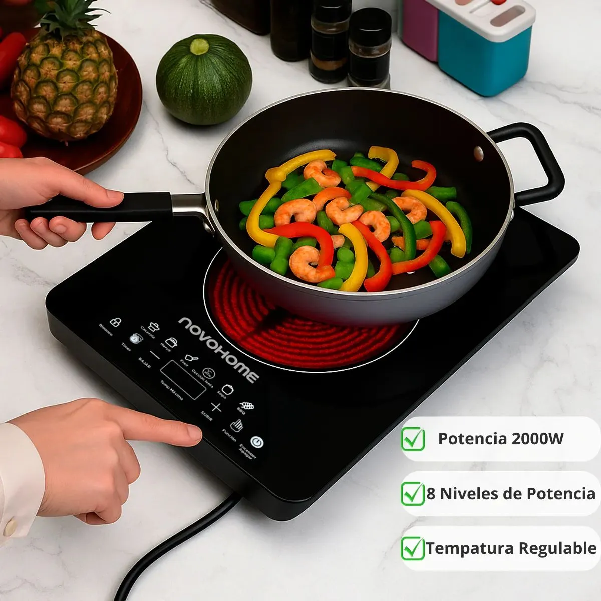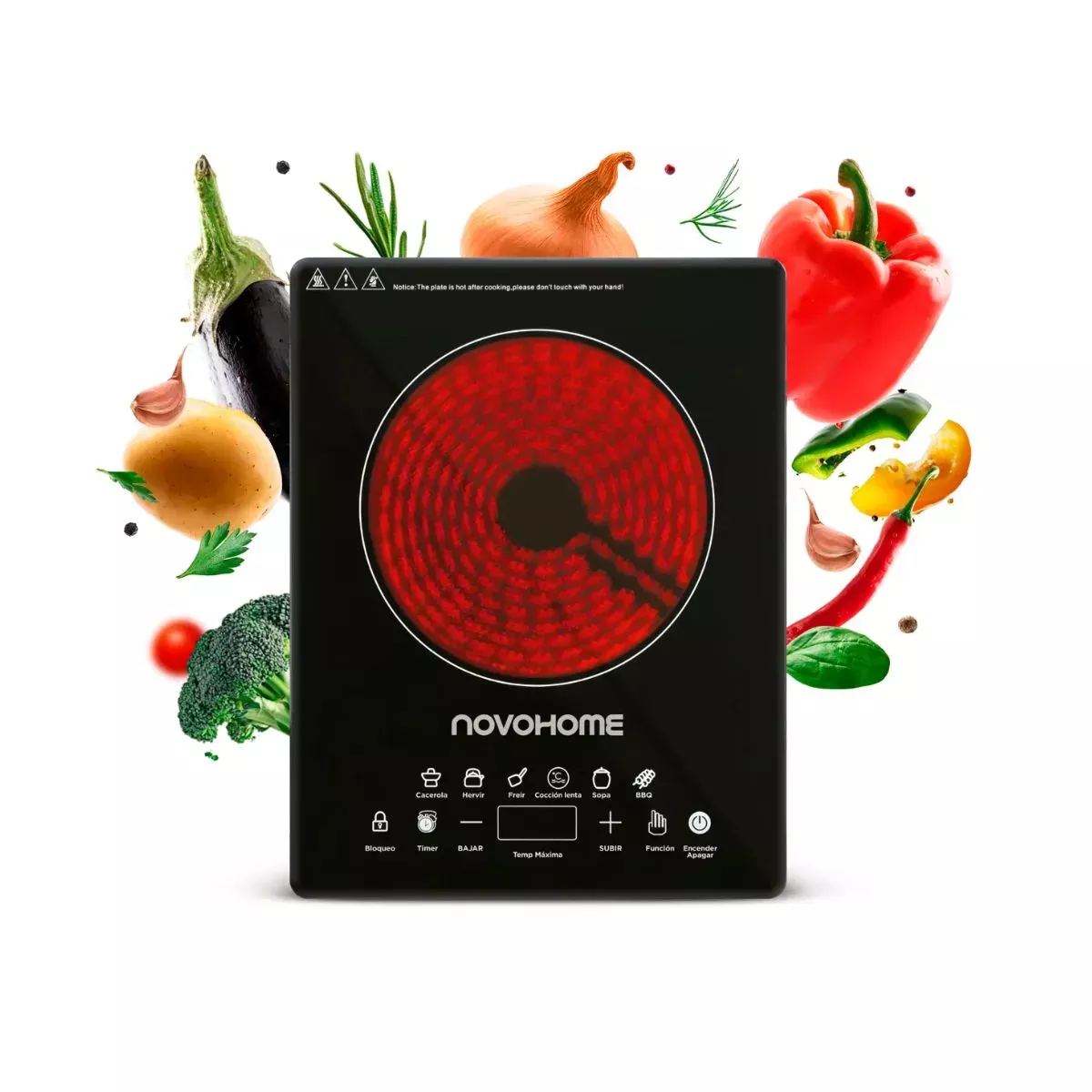 El Anafe Eléctrico Vitrocerámico Novohome NH-AV1000 es la solución ideal para quienes buscan funcionalidad y estilo en la cocina. Con un diseño elegante en color negro y una superficie de vidrio templado, este anafe no solo es atractivo, sino también muy fácil de limpiar. Equipado con un quemador de 2000 W y 8 niveles de potencia, permite un control preciso de la temperatura, adaptándose a todas tus necesidades culinarias. Su control táctil digital facilita la operación, mientras que el temporizador integrado te ayuda a gestionar mejor el tiempo de cocción. La seguridad es una prioridad; el anafe cuenta con válvulas de seguridad, bloqueo de seguridad y protección contra sobrecalentamiento, brindándote tranquilidad mientras cocinas. Con dimensiones compactas de 30 cm de ancho y 7 cm de alto, se adapta perfectamente a cualquier espacio, siendo ideal para cocinas pequeñas o para quienes disfrutan de una experiencia gastronómica sin complicaciones. Disfruta de la versatilidad y practicidad del Anafe Eléctrico Vitrocerámico Novohome NH-AV1000, preparado para convertirse en tu aliado culinario. Crea platos deliciosos en un instante y transforma tu forma de cocinar con esta eficiente herramienta de cocina.