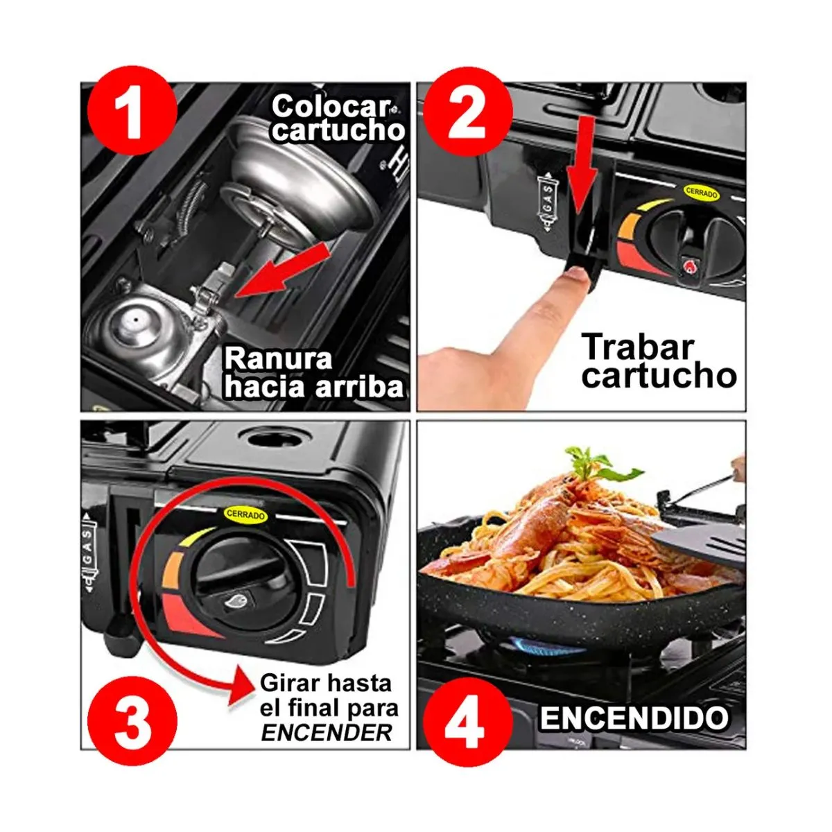 Características del producto: - Encendido electrónico con temperatura regulable. - Sistema de liberación de cartucho para mayor seguridad. - Compatible con cartucho descartable (no incluido). - Aro protector de viento integrado alrededor de la llama. - Plato de soporte esmaltado para mayor durabilidad. - Mecanismo de bloqueo de seguridad. - Ideal para uso en exteriores y como kit de emergencia. - Fácil de limpiar y transportar (incluye maletín). Especificaciones técnicas: - Consumo: 168 g/h. - Potencia: 2,5 kW. - Inyector: 0,55 mm. - Medidas: 34 x 23 x 8 cm. - Peso: 1,15 kg. Medidas de embalaje: - 34 x 23 x 8 cm. - Peso total: 1,15 kg.