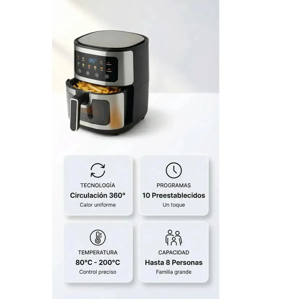La Freidora de Aire Aitech 10L ofrece gran capacidad y practicidad para cocinar de forma rápida y saludable. Con 1400W de potencia, utiliza tecnología de aire caliente que permite preparar comidas crocantes por fuera y tiernas por dentro con hasta 80% menos de aceite. Su amplio diseño de 10 litros es perfecto para familias o reuniones, ya que permite cocinar grandes porciones en una sola tanda. Además, cuenta con 10 modos de cocción preestablecidos, ideales para papas fritas, pollo, carnes, vegetales, repostería y más. Su acabado en color negro aporta un estilo moderno y elegante a tu cocina. Capacidad: 10 litros Potencia: 1400W Cocina con hasta 80% menos de aceite 10 modos de cocción preestablecidos Diseño moderno en color negro Ideal para familias y reuniones