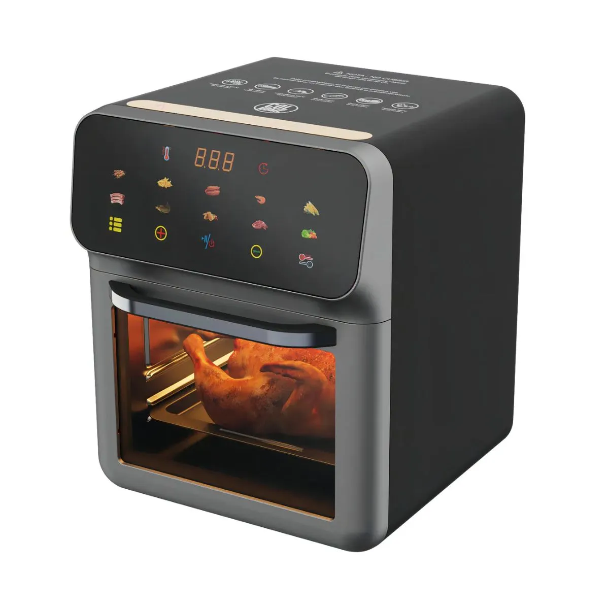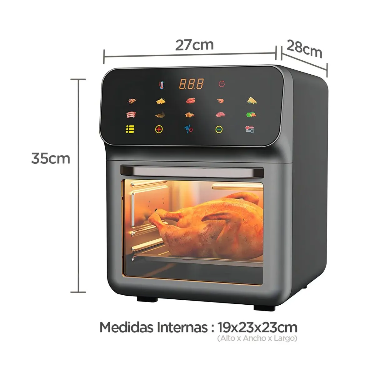 Características principales: Capacidad: 10 litros, ideal para familias y reuniones Potencia: 1500W para un cocinado rápido y uniforme Control de temperatura: ajustable hasta 200 °C 10 programas automáticos para diferentes tipos de comidas Circulación de aire caliente 360° para una cocción homogénea Sistema de apagado automático al retirar el canasto Mango resistente al calor: mayor seguridad y comodidad Dimensiones del producto: Externas (Ancho x Largo x Alto): 27 cm x 28 cm x 35 cm Internas (Ancho x Largo x Alto): 23 cm x 23 cm x 19 cm Incluye 2 bandejas de 22,5 cm x 20,5 cm Beneficios: Cociná sin aceite, comidas más saludables y sabrosas Mayor capacidad para preparar varias porciones al mismo tiempo Fácil de usar con funciones preestablecidas Diseño digital y moderno Seguridad garantizada con apagado automático
