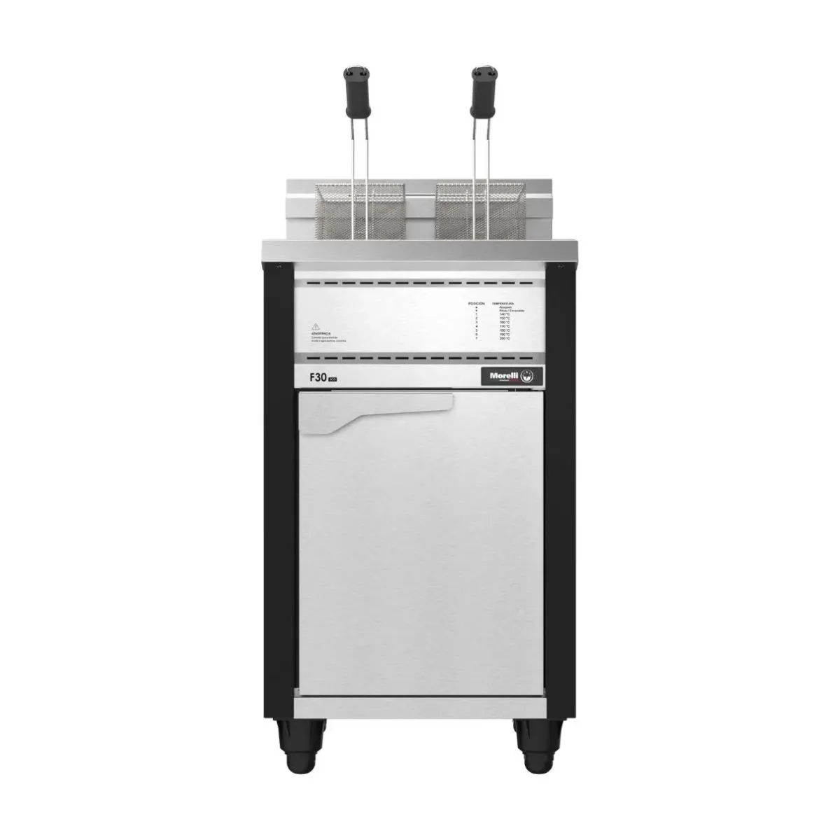 MEDIDAS: Ancho: 52cm Profundidad: 75cm Alto: 90cm (110cm con respaldo). Características del modelo: - Capacidad: 30 Litros - ACEITE y AGUA - VÁLVULA AUTOMÁTICA. Características Generales: Exterior construido en Acero inoxidable esmerilado, control automático de temperatura, tacho enlozado de fácil limpieza, rápida recuperación, no mezcla sabores, 2 canastos porcioneros nequelados, válvula de seguridad, llave escluza de desagote de impurezas
