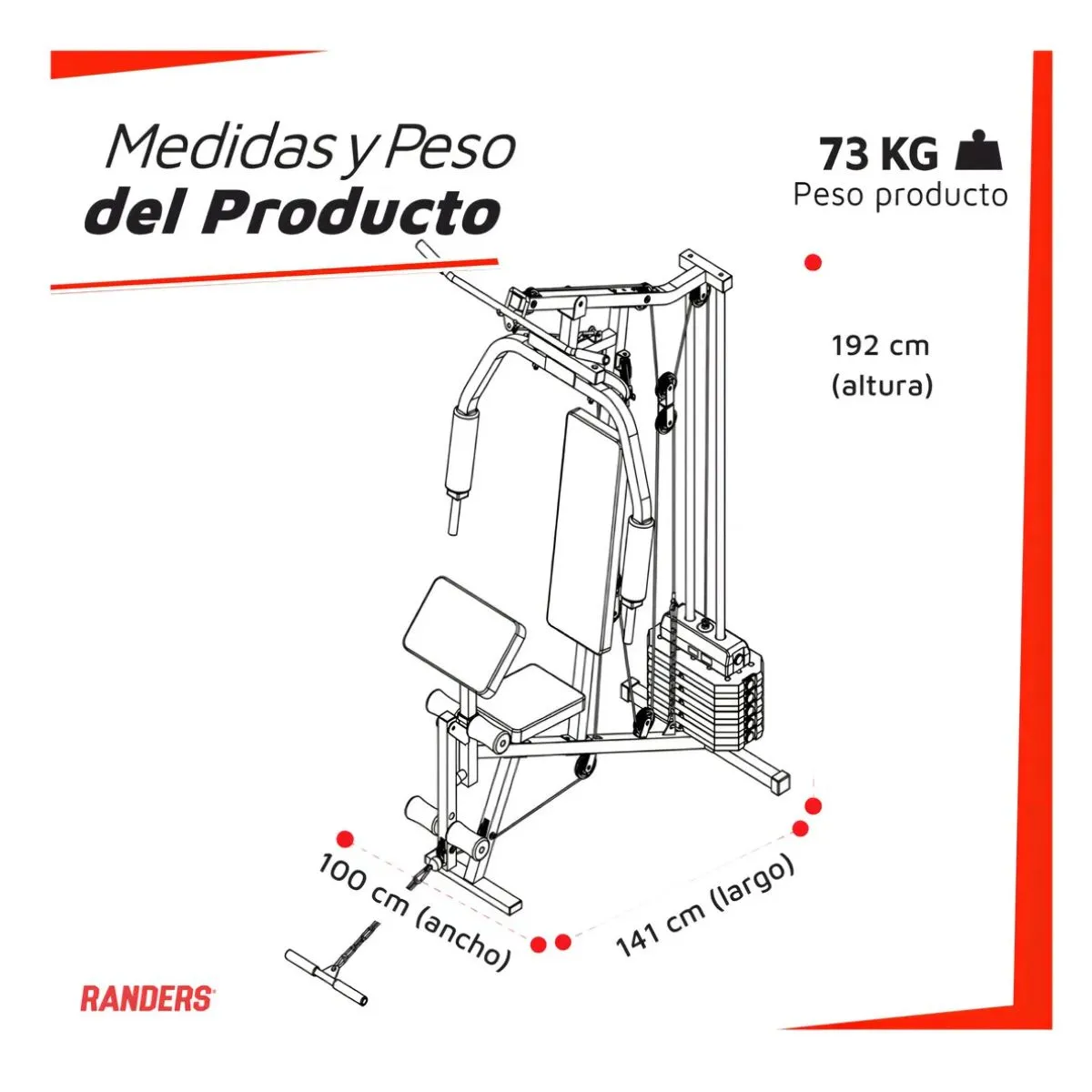 Tipo: Multigimnasio. Incluye estación Scott. Incluye 45Kg de carga (7 ladrillos + Pesa Tope) Incluye barra dorsalera y barra corta Asientos acolchados de cuero sintético rellenos de espuma de poliuretano Permite realizar una rutina completa de ejercicios gracias a sus cuatro estaciones: espalda, tríceps, press de pecho, pectorales mariposa, dorsales, hombros, cuádriceps, isquiotibiales, bíceps, abdominales y remo, entre otros.