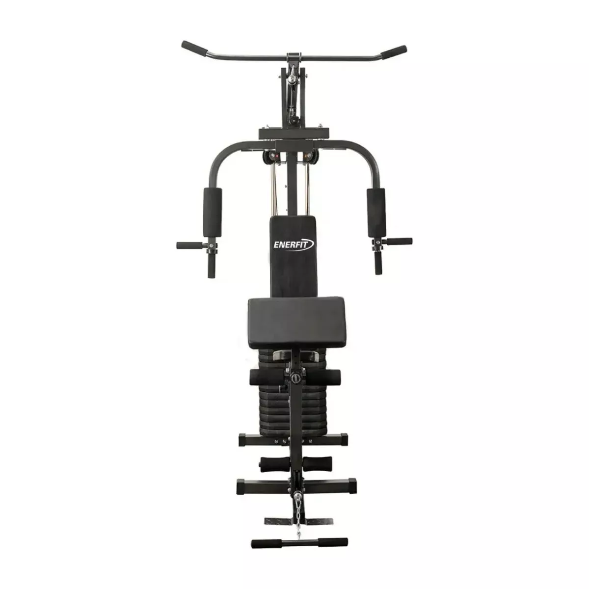 MULTIGIMNASIO ENERFIT 960 - Incluye DORSALES, PECHO MARIPOSA, PECHO PLANO, POLEA ALTA, POLEA BAJA, REMO, TRICEPS, BICEPS, CUADRICEPS, FEMORALES, GLUTEOS. - Incluye barra larga para dominadas y barra corta para biceps, triceps y remo. - 70 kg de lingotes de cemento y granalla metálica recubiertos. - Peso máximo del usuario: 140 kg. - Poleas con ejes de acero y rodamientos reforzados. - Sistema anti-ruido entre las pesas. - Cable de acero reforzado. - Rodillos de alta densidad. - Sistema de clavija para regular el peso de la carga. DIMENSIONES Y PESO ARMADO 114 X 117 X 201 CM DIMENSIONES Y PESO EN CAJA 1 CAJA DE ESTRUCTURA PRINCIPAL - Peso: 40 kg - 43 x 175 x 19 cm (ancho x largo x alto) 2 CAJAS CON PESAS - Peso: 70 kg - Medidas: 20 x 38 x 27 cm (ancho x largo x alto)
