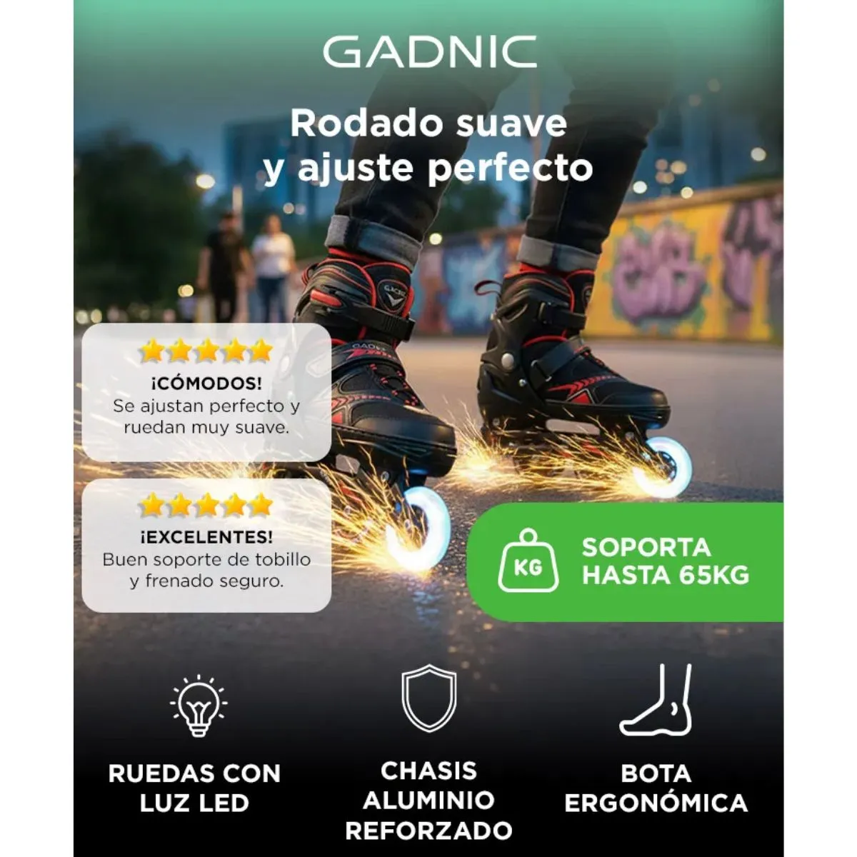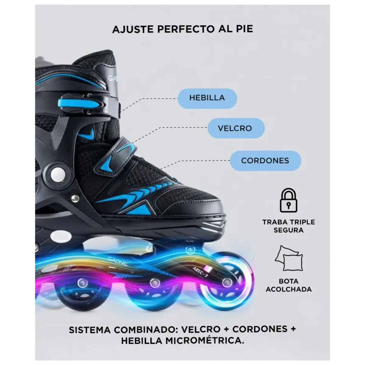 CARACTERÍSTICAS: - Chasis de Aluminio - Ruedas Siliconadas 82A PU con luces - Realizado en PVC Virgen - Respiración en parte delantera y Trasera - Sistema De Protección de Tobillo - Ruedas Intercambiables - Sistema Extensible - Talle S: Ruedas de 60mm - Talle M: Ruedas de 65mm - Talle L: Ruedas de 70 mm - 1 Freno de Pvc - Luz en la rueda delantera